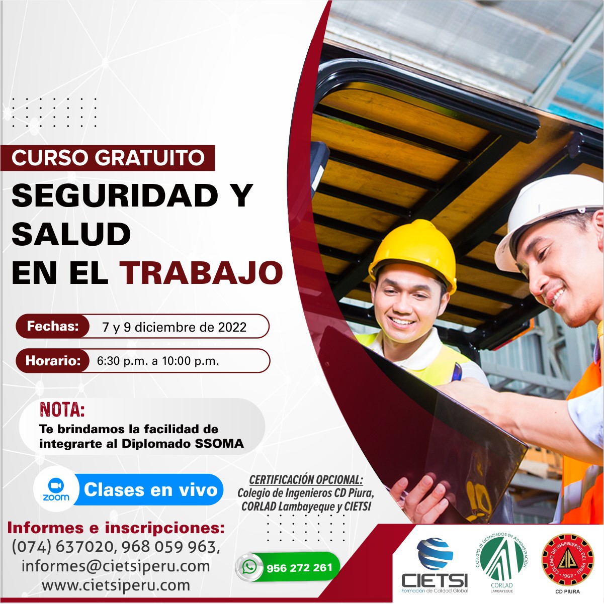 + Realizado el pago comunicarse con nosotros enviando un email a informes@cietsiperu.com o al WhatsApp: 956272261 o 968059963, con los siguientes datos (nombres completos, DNI, teléfono/celular, asunto: Certificación en Seguridad y Salud en el Trabajo), adjuntando el comprobante de pago, luego de validar nos comunicaremos con usted a la brevedad.