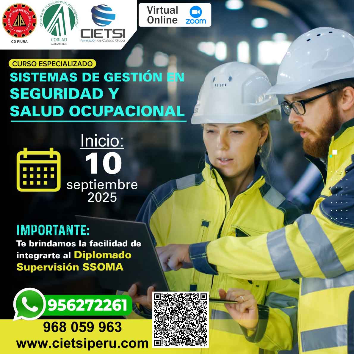 + Te brindamos la oportunidad de integrarte Diplomado de Especialización en Supervisión de Seguridad, Salud Ocupacional y Medio Ambiente SSOMA con opciones de certificación con la Universidad Nacional de Trujillo, Colegio de Ingenieros del Perú CD Piura, Colegio de Licenciados en Administración Región Lambayeque o CIETSI.