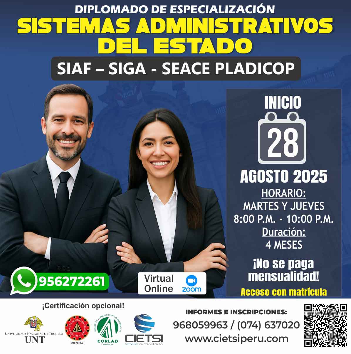 DIPLOMADO DE ESPECIALIZACIÓN EN LOS SISTEMAS ADMINISTRATIVOS DEL ESTADO: SIAF, SIGA Y SEACE DE LA PLADICOP 2025